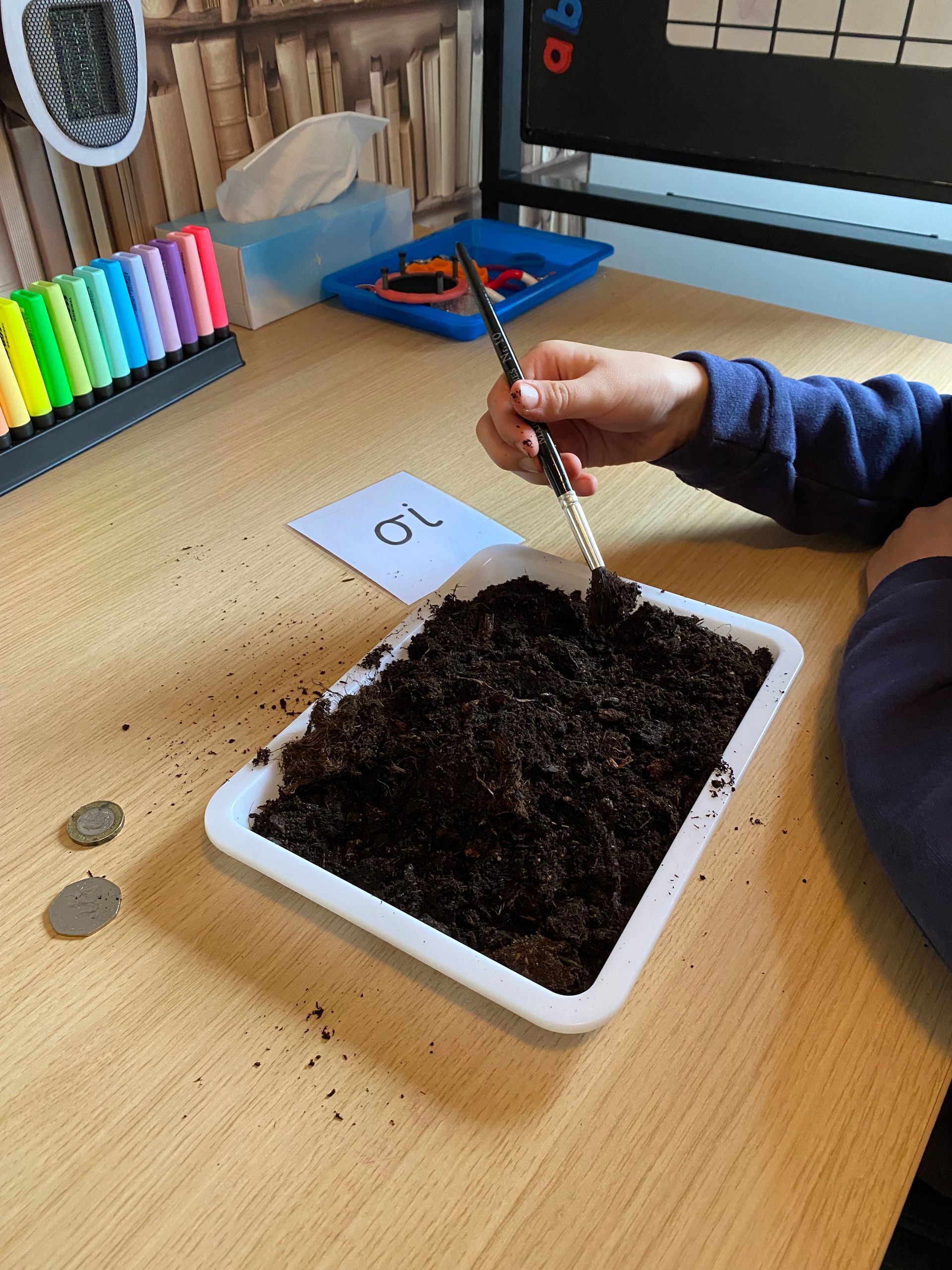 Multisensory teaching of the digraph 'oi'. Finding coins hidden in soil.
