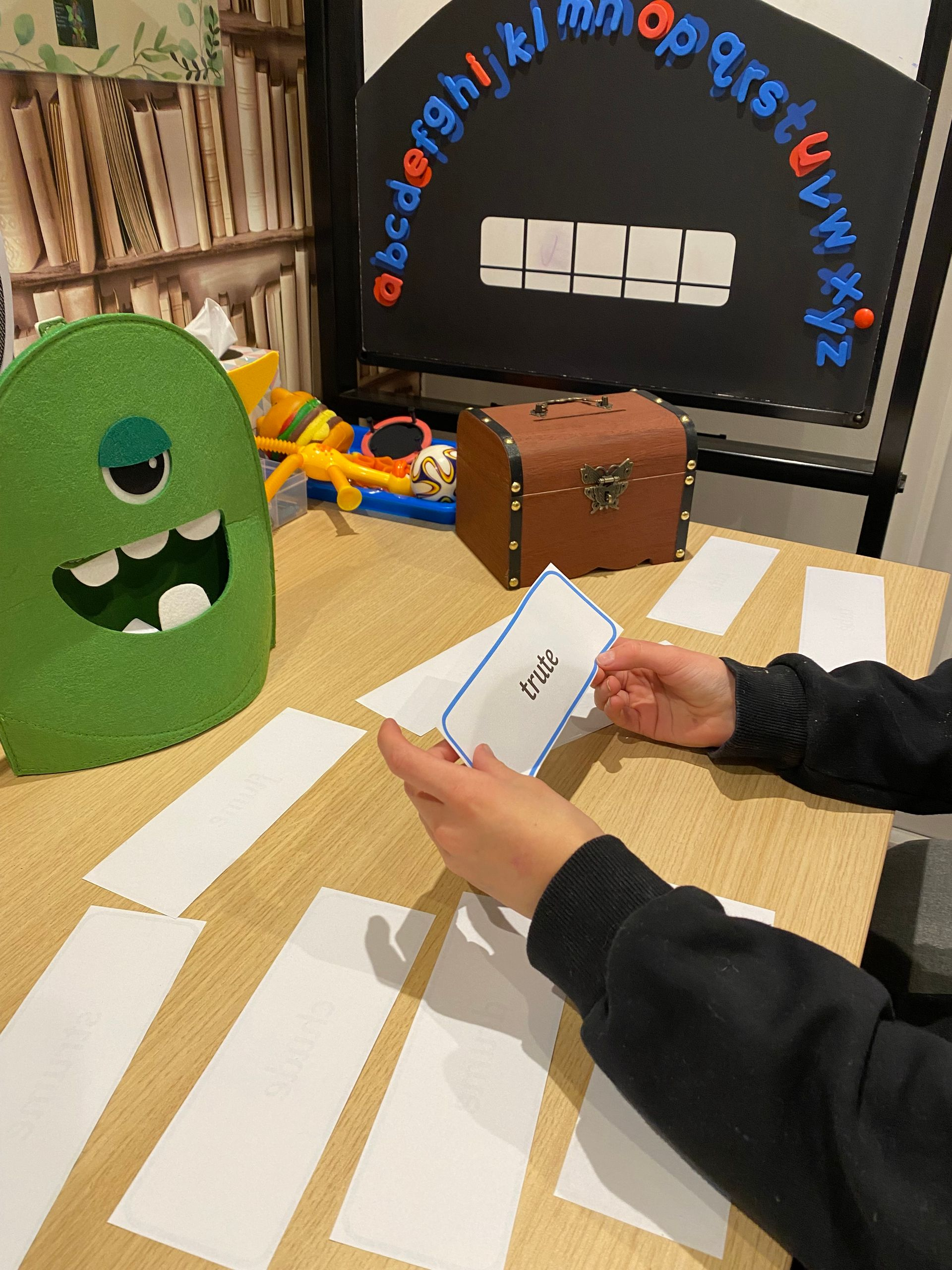 Phase 2 Phonics: Learning the 'ee' digraph by hanging 'ee' pictures in a tree.